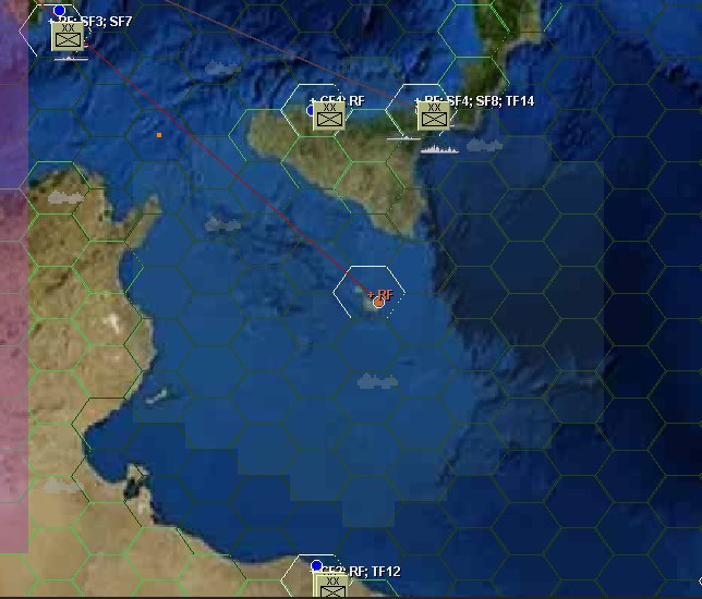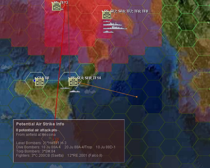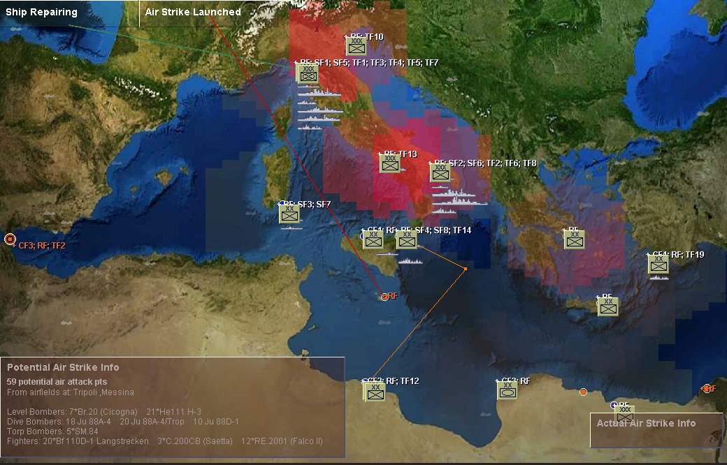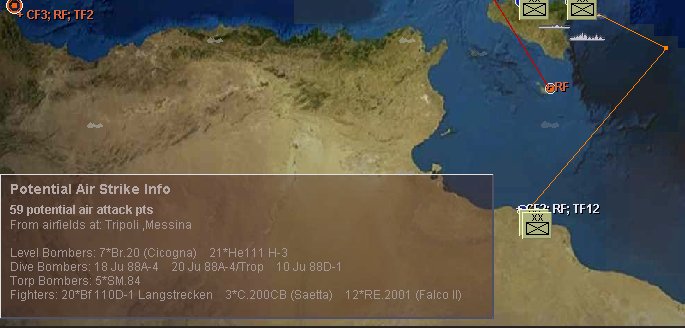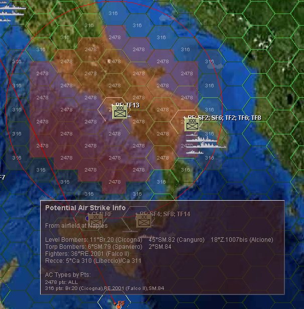 The picture below shows an example: the Italian player in a Mediterranean scenario is viewing how his air power projects: