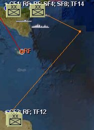 Note that for the purpose of the Theatre Map, enemy air power is a one-time snapshot, taken at midday on the last day of the turn calculation. Use it as a guide only. Also note that on the theatre map, you do not see the orange source lines because normally they would point to the location of any carriers; but because the data is taken at a fixed time, the exact location may not accord with the very latest intel you have on enemy fleet movements. Given this, the source lines may be confusing.