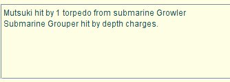 As well as the kind of details mentioned above, a scrollable text box at the bottom of the screen summarises the number of torpedo hits and depth charge attacks by individual submarines and surface escorts.