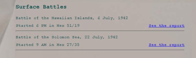 This is the first appendix. It provides links to all battles that occurred last period. The battles may be between surface ships, or air strikes on ships or land targets, or submarine attacks, or surface ship or aerial bombardment of land targets, or amphibious assaults. Damage from mines is also summarised. An example is shown below: