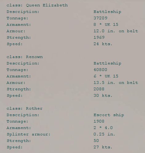 This appendix shows a summary of the design details for each enemy ship class. Remember – this information may be inaccurate in certain respects. The information is obtained from enemy ship sightings and general intelligence gathering. It will become more accurate as your naval intelligence level increases and also as you obtain more sightings of ships of the class.