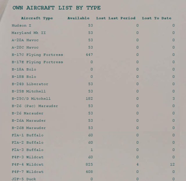 This appendix list all your current aircraft by type, showing for each type the number currently available, and the numbers lost last turn and in total since the start of the game: