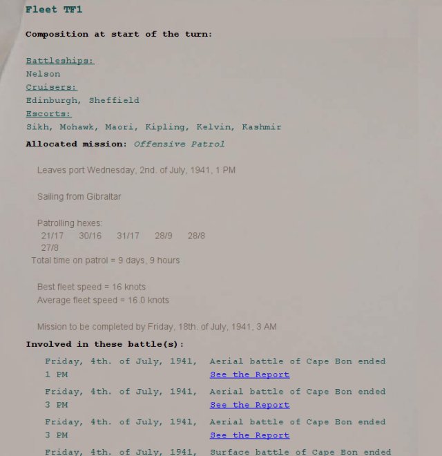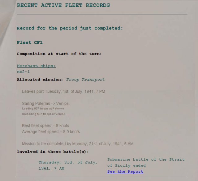 Version 1.1 has introduced a new feature: fleet records. From turn 2 onwards, reports for each fleet of major actions in the previous turn are outlined here, as well as summaries of the kind of mission the fleet was on (if the mission was a 2IC generated one). The report includes handy hyperlinks to all battles each fleet was in during the last turn. The following example shows Italian fleet CF1 - its initial composition, convoy mission orders, and reference to (and a link to) a submarine encounter: