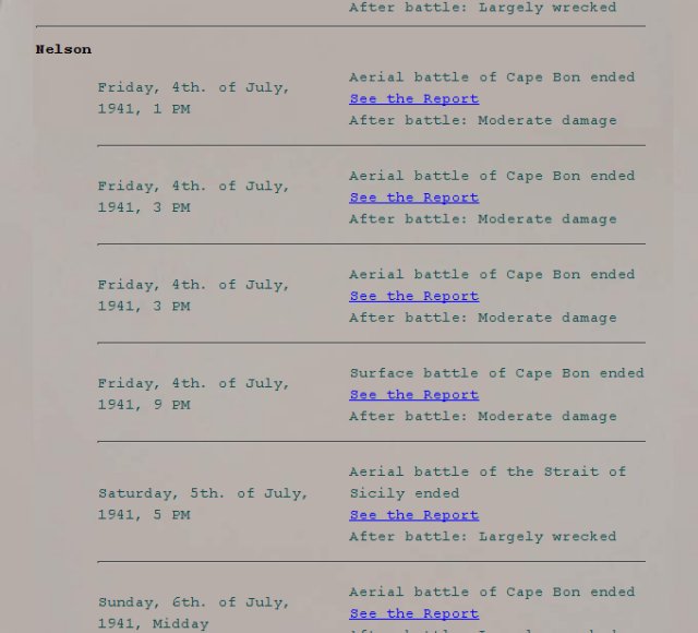 Version 1.1 has also introduced service records for your ships for the last turn. From turn 2 onwards, reports for each ship of major actions in the previous turn are outlined here. The report summarises the status of each ship after each battle, and has hyperlinks to all the battles. The following example shows the battleship Nelson's involvement in a series of battles in the last turn: