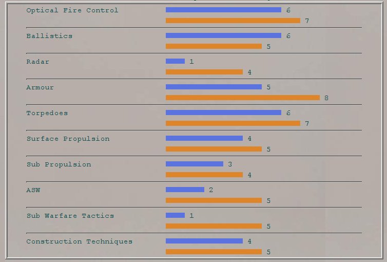 Your current position relative to the enemy's estimated strengths is summarised, and shown graphically. Your levels are shown in blue. The enemy’s estimated technology levels are shown in orange.