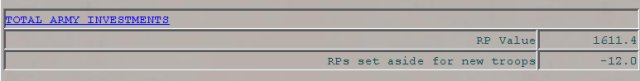 Also shown are the number of RPs that are currently set aside for raising and training more troops in the current turn. These RPs have been set aside automatically. In the build troops phase of a turn, you commit this expenditure. Refer to how to build troops for more information.
