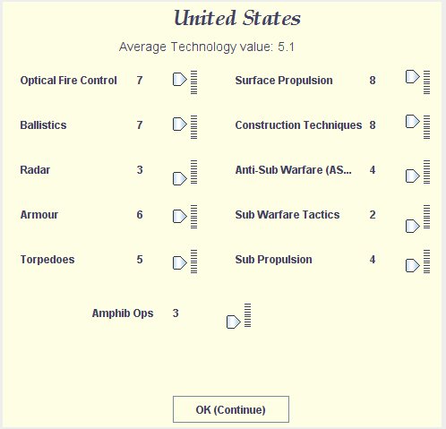 There are twelve key technologies - such as radar, ASW, machinery propulsion, ballistics, armour quality and so on - which have a significant impact on the performance of each country's naval and airforces. See technologies for more information.