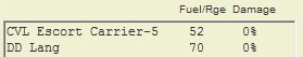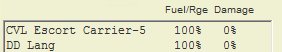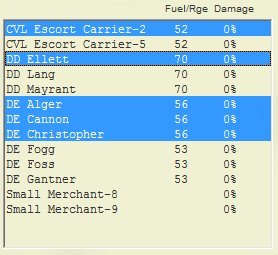 The ship list shows at a glance the damage status and bunkerage or endurance of each ship. In the example below, the hex range and degree of damage (as a percent) are shown for the carrier and one of the destroyers:
