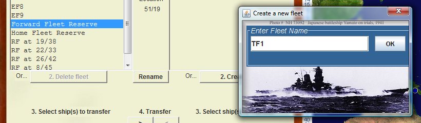 Note that if the fleet you have selected is an emergency fleet, the create fleet button will not be enabled. The reason for this is that emergency fleets are automatically created by the computer at run time, in response to things like fuel shortages, or damage. Ships in these fleets need to return to the nearest suitable port, and that is the orders that the computer has given the fleet. If you were able to move ships out of the emergency fleet, the computer at run time would just put them back again.