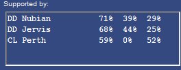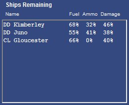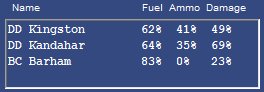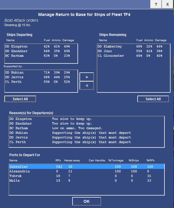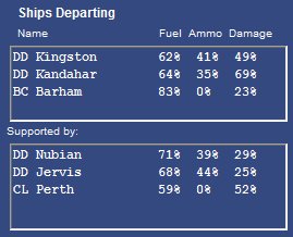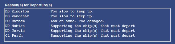 In the above example, the destroyers Kingston and Kandahar must leave because they are damaged and now too slow to keep up with the fleet, while the Battleship Barham is both too low on ammunition and too damaged.