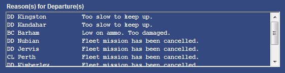 Each ship is listed with the current state of its fuel, ammunition and damage shown in percentage terms. You can quickly see from this what the problem is. But the reason for departure is also explained in the middle section of the dialog: