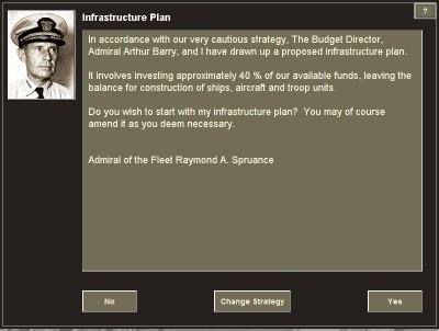 Your 2IC is ready - with one button click - to plan all infrastructure spending for you for the turn in a way that accords with your overall strategy.