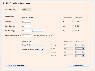 When you are finished, click the "Commit Funds" button at the bottom right of the screen. The set allocations will now be taken, and the screen will close, returning you to the Admiral's Office.