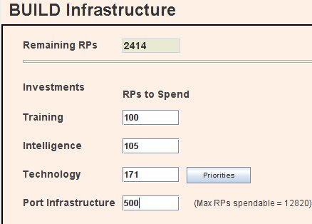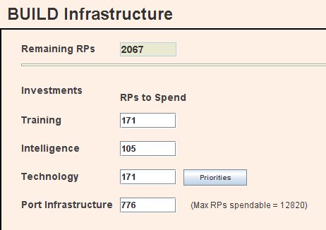 Reducing any expenditure amount on the build infrastructure screen correspondingly increases the remaining RPs. In the picture below, the player has reduced expenditure on training to 100, and that on port infrastructure to 500. The remaining RPs are now correspondingly increased to 2414: