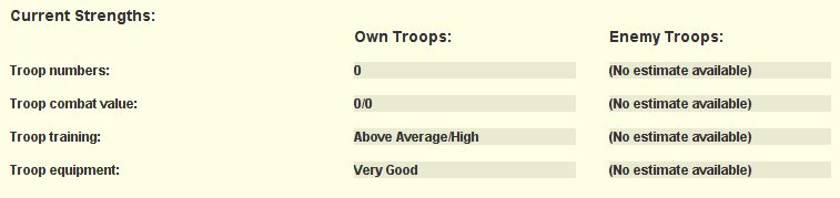 Remember that these are totals across all troop units. You can see these values broken down unit by unit in the Situation Report - Troop List as well as on the theatre map when you have ticked the 'Show own pop-ups' option. (See the theatre map for more information).