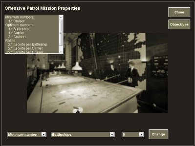 Remember also that all you are doing here is setting objectives for one or more selected mission types. Your 2IC still decides which ships will be in the mission (and from where they will come). You can indirectly influence the composition of fleets by setting rules for the minimum and optimum numbers of types of ships for the mission - see setting ship numbers in the fleet in the next section. Or you can directly control the actual allocation of ships but for this you will need to know how to edit or create your own missions - see how to edit missions for more information.