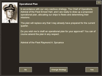 The screen has some help text, some buttons, and a picture of your 2IC. Shown below is an example for the US player, relying on Admiral Spruance as his (very cautious) strategist: