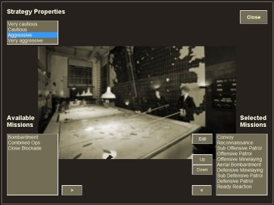By way of some examples, a very cautious strategy will not by default include close blockade or bombardment missions and will limit offensive operations to submarine patrols. Conversely, a very aggressive strategy will favour aggressive patrols, bombardments and blockades ahead of defensive missions.