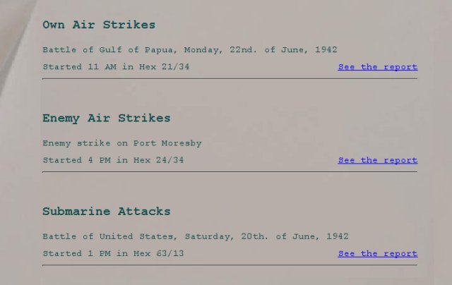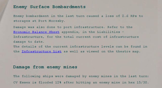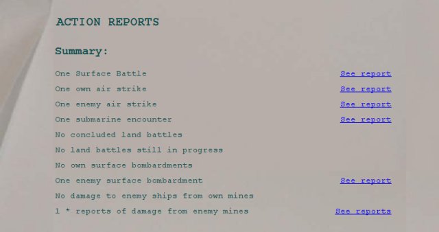 Except for the first turn, the report gives an overview of action from the last turn with links to any battles and summary information on losses of ships, troops and aircraft and a detailed economic balance sheet. Enemy intelligence is also summarised - their technology, current order of battle for their navy, and intel on their ship characteristics. Details of all your own resources - ships, troops, aircraft and infrastructure at your ports and airfields are provided, as are summary service records for your fleets and ships.