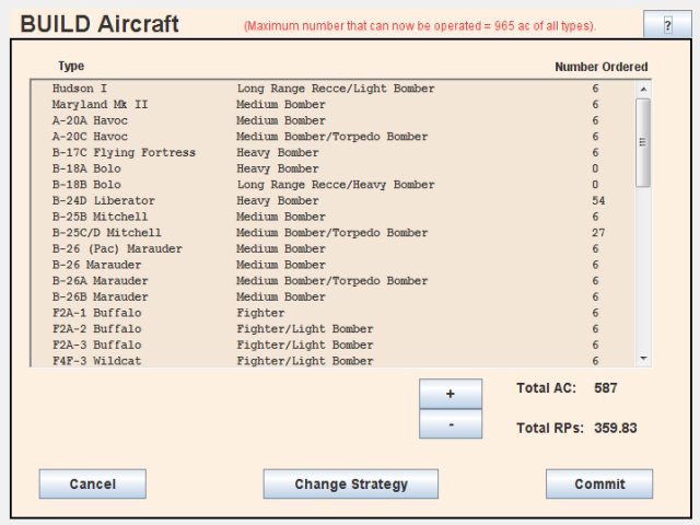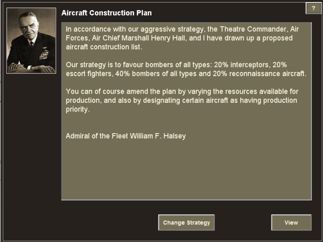 Your 2IC is ready to plan the construction of new aircraft suited to your overall strategy. (For example, more aggressive strategies favour more bombers). You can change the strategy but for now, click the 'View' button