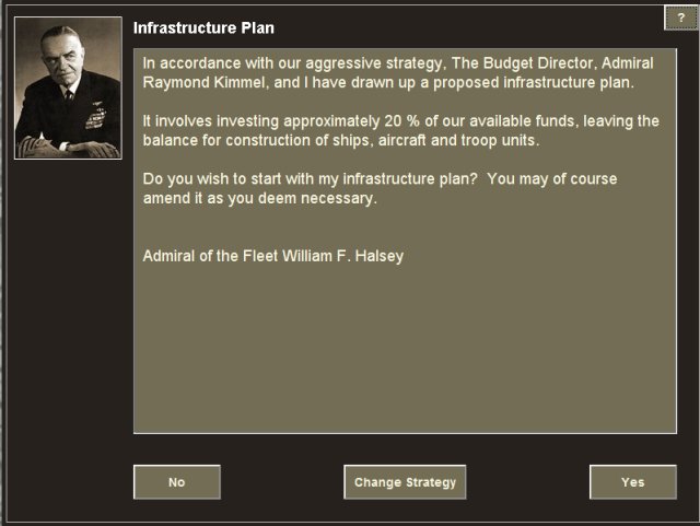 Your 2IC has planned how many resource points (RPs) to spend on infrastructure, and where to spend them - based on your current 'aggressive' strategy. To see the plan, click the 'Yes' button at the bottom-right of the screen: