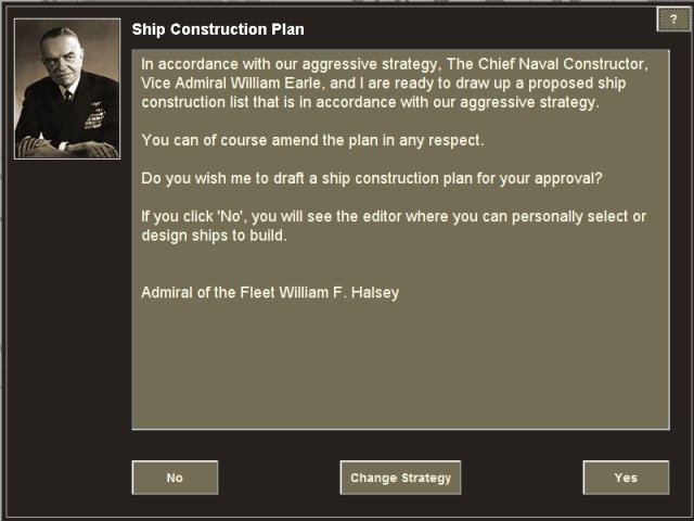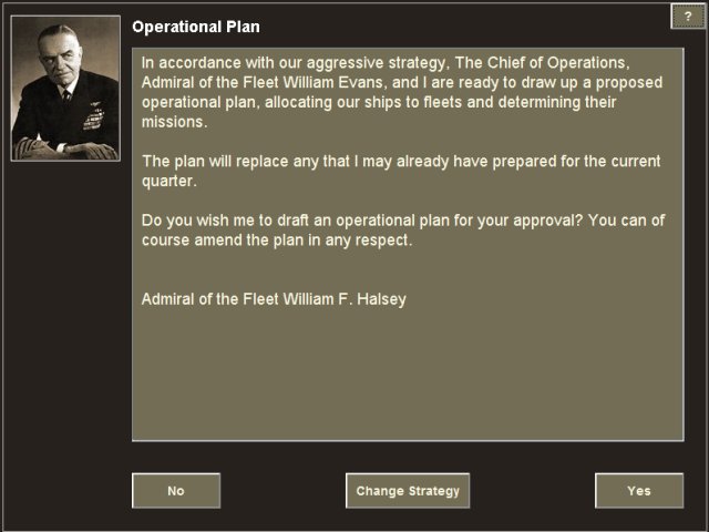 From here, it is up to you how deeply you wish to delve in your games. You have seen how easy it is to make all your crucial decisions simply by relying on your 2IC. But when you are ready and interested, you can learn how to take more control in any area: perhaps selecting or designing some ships, or even your whole navy; or taking a more active role in operational orders, using any of the multiple command levels that are possible. During turn calculation, you may want to take hands on control of specified fleets or airfields, determining fleet emergency orders and air strike targets and profiles. You may want to reduce the length of the operational turn to one or two weeks, so that you can direct the war effort in considerable detail. You can also learn to use the Campaign Creator to set up your own campaigns, accepting historical default values or playing with history as you see fit.