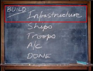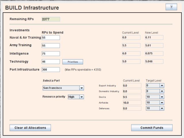 Infrastructure means the facilities at each of your ports - dockyards, defences and surrounding airfields as well as the level of industrial development servicing the port. It also includes your training facilities and levels of technology R&D and enemy intelligence.