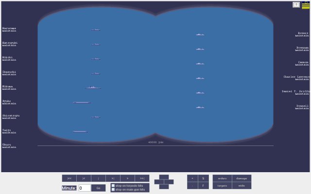 The screen has many controls for re-playing the battle forward or backwards at varying speed, zooming in and out, and optionally stopping on main gun or torpedo hits. You can view the ships changing target and movement orders and watch as damage of varying kinds accumulates on each ship.