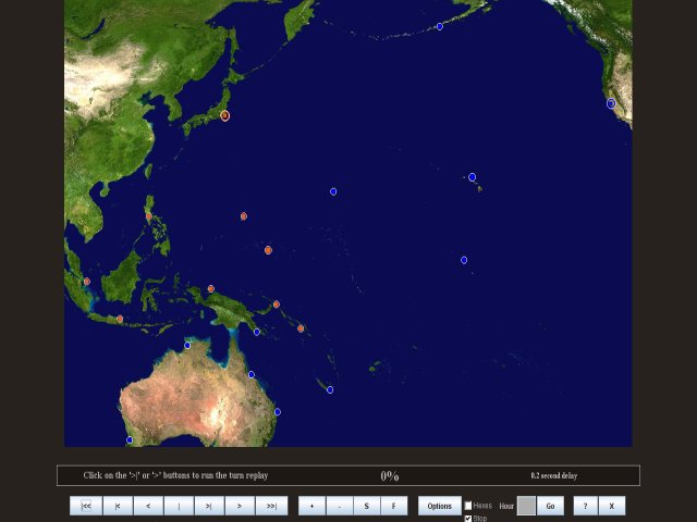 The replay is paused waiting for you to start it. Use the '>' or '>|' controls to move the replay forward either continuously or an hour at a time. The '>>|' control takes you to the end. The '|<<', '|<' and '<' controls work the same, but in reverse. The '|' button pauses the replay. For an overview of this and other features of the replay screen, see replay the turn.