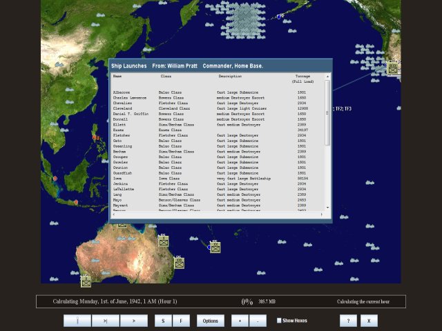 The map shows the geographic location and status of your own fleets and and known enemy fleets and ships, as well as your own and enemy troop and aircraft strengths. You can see detailed mappings of how your air power currently projects into every hex of the thetare map; and you can do the same for the enemy's air power (as known to you from your intel). You can also see your own minefields and suspected enemy minefields. And you can link to detailed information about the current orders for all of your fleets.
