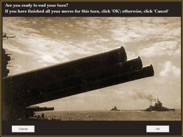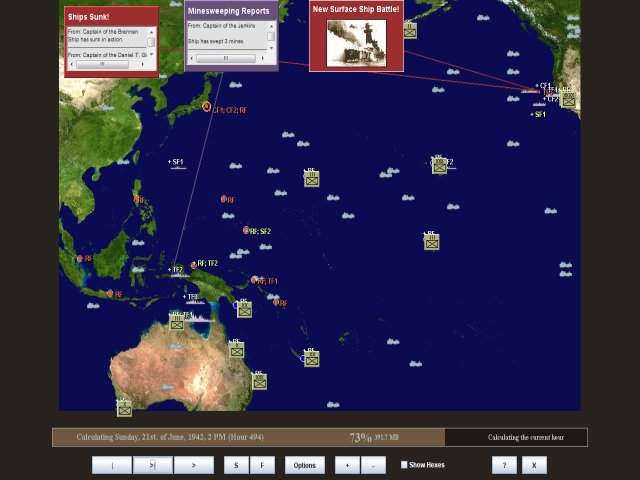 Some events are more important than others of course - such as reports of surface battles, air strikes or submarines encounters. The battle messages have links to detailed reports and, in the case of surface battles, full shell-by-shell action replays! Do not be concerned at this stage about following all the action. Later you can learn how to slow down or pause the calculation. In any case, all of the action is fully replayable at your leisure in the turn replay, which you will see soon. And the action is also summarised in the Briefing Report.