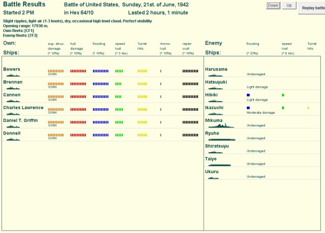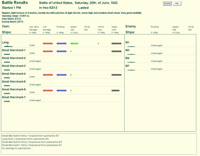 The summary should list a variety of actions: for example: a surface battle, some air strikes by you and your enemy, a submarine encounter, a surface bombardment and one instance of damage from enemy mines: