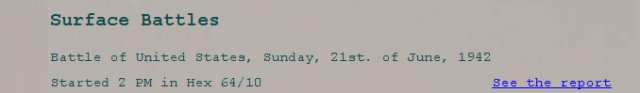 If you click on the 'See report' hyperlink, adjacent to where it says "One surface battle", you will jump to the 'Surface Battles' section of the Action Reports. Here, any battles are listed in more detail: