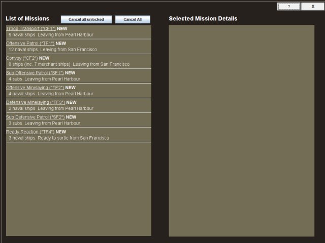 You can view the details of any of the missions, cancel any and try again, but for now, just note that that you have some convoy and troop transport missions, some offensive patrols by surface ships and subs, and some minelaying missions. The remainder of your ships are placed in 'Ready Reaction' fleets - available to steam out at short notice to intercept enemy that come close enough.
