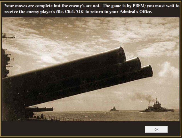 Clicking the 'OK' button returns you to your Admiral's Office. The turn calculation cannot start until you have received the enemy's end-of-turn file and have saved it to your PBEM folder.