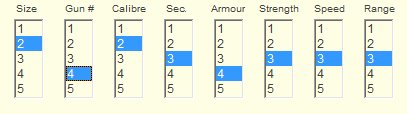 The screen lets you set any of these variables with one mouse click. As any factor is increased or reduced, the ship's fighting capability in the chosen area will be increased or lowered, as will the ship's full load tonnage. You can see the ship design details change as you change any of the factors.