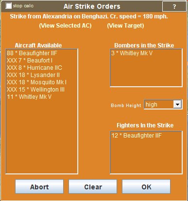This pop up dialog box allows you to abort or amend a proposed air strike against an enemy target from one of your airfields or carriers.