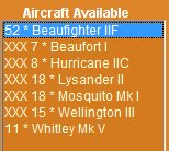 All aircraft that are unsuitable are listed in the "Aircraft Available" list but are marked as unsuitable with three crosses ("XXX"). This gives you an immediate visual clue as to the currently unsuitable aircraft types. In the illustration below, the Beaufort, Hurricane, Lysander, Mosquito and Wellington are all marked as unsuited to to the current strike: